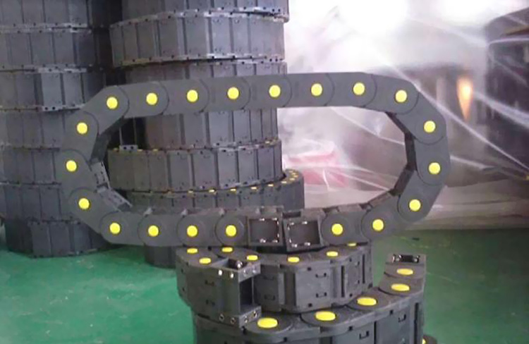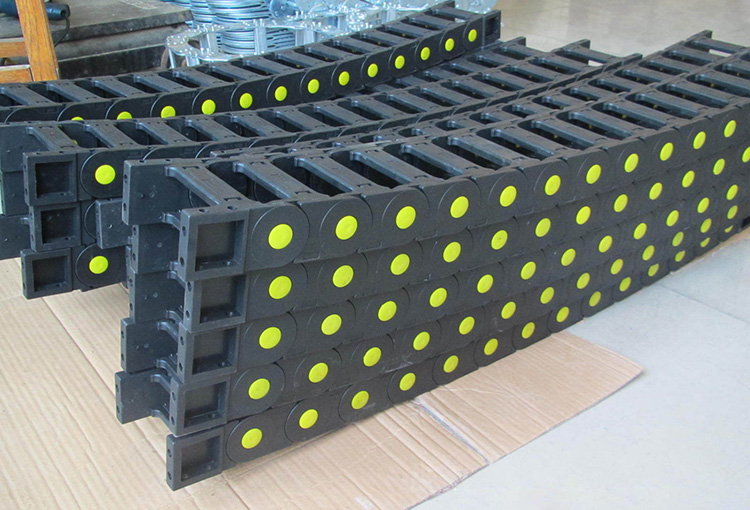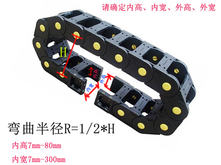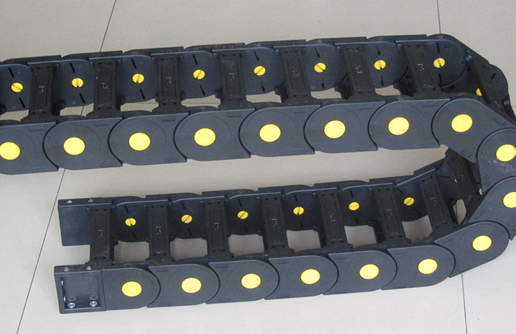 (3)單元鏈節由左右鏈板和上下蓋板組成,拖鏈每節都能打開,裝拆方便,不必穿線,打開蓋板后即可把電纜、油管、氣管、水管等放入拖鏈。
