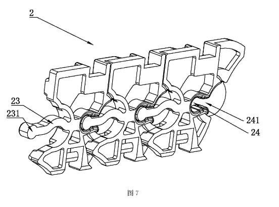 6.根據權利要求5所述的新型的塑料拖鏈,其特征在于:任意一側板設有橫向勾槽的另一端開設有卡接缺口,所述縱向卡塊設于該卡接缺口內,且所述縱向卡塊的兩端分別與卡接缺口的內壁固定連接,所述縱向卡塊與卡接缺口的底壁間設有卡接間隙。