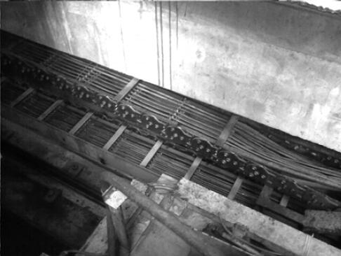 通過觀察,鋼卷運輸車的拖鏈在運行過程中中間有下垂的現象,這主要是由于鋼卷運輸車的行程較長。入口鋼卷運輸車的行程為13000mm,出口鋼卷運輸車的行程為14000mm,而在這么長的行程范圍內在設計上拖鏈完全沒有任何支撐。當鋼卷運輸車運行到遠端時,拖鏈的中間部分已經彎曲變形甚至與地面接觸,而在拖鏈上安裝的液壓軟管和電纜也同樣隨之彎曲甚至與地面摩擦,經過反復的彎折,拖鏈中的電纜芯容易疲勞斷裂,造成鋼卷運輸車故障不能正常工作。電纜線斷裂故障除了與其在隨拖鏈運動時反復彎折有關外,電纜線在拖鏈內的分布也對其有很大的影響。拖鏈一般是由單元鏈節由左右鏈板和上下蓋板組成,拖鏈每節都能打開,裝拆方便,不必穿線,打開蓋板后即可把電纜、油管、氣管、水管等放入拖鏈。而在拖鏈的內部另外可提供分隔片,將鏈內空間按需要分隔開。鋼卷運輸車的電纜線連同液壓軟管通過分隔片被固定在拖鏈內,但是液壓軟管與電纜的分布孔過于集中,安裝后電纜線比較擁擠,一些較細的電纜線甚至被卡在分隔片與鏈板間。通過分析認為,電纜線分布集中,被捆扎在一起,而且電纜線隨拖鏈反復擠壓、彎曲折損,時間一長造成電纜線疲勞斷裂。改造前電纜線和液壓軟管在拖鏈內的分布如圖1: