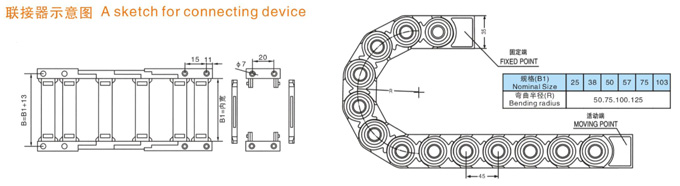 TL1型塑料拖鏈規格型號設計為組合式加強型,可任意上下開啟,安裝方便,結構合理堅固耐用.