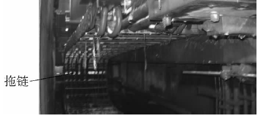 圖5 為某鋼廠熱軋廠卷取機拖鏈,型號: 帶限位碰塊鋼制拖鏈TYP203 - 605 × 700 × 5550,使用國外某品牌產品使用周期不到一年,使用長壽命鋼制拖鏈使用壽命提高到三年。